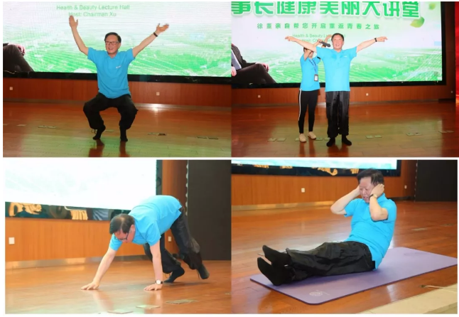 指導(dǎo)大家服用保健品后,徐之偉一次性完成深蹲蛙跳100次、仰臥起坐50次、來回以爬代走等動作做演示。大家觀看后無不佩服他強健的體力與充沛的精神狀態(tài),堅持完成這一系列動作后更能體會他的健康養(yǎng)生秘訣的實用性與效果。