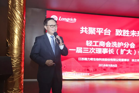 9月6日,由中國輕工工藝品進出口商會主辦、江蘇隆力奇生物科技股份有限公司承辦的輕工商會洗滌化妝個人護理用品分會一屆三次理事長(擴大)會議在隆力奇隆重舉行。輕工商會副會長陳江峰,分會理事長、寧波華孚進出口有限公司總經(jīng)理相瓊穎,分會秘書長程國旗等領導出席了會議,隆力奇董事長徐之偉應邀出席會議并作主旨演講。本次會議由分會秘書長程國旗主持。