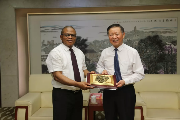 圖:2018年8月13日,尼日利亞駐上??傤I(lǐng)事安德森-馬杜比克等一行考察隆力奇,徐之偉會見考察團。