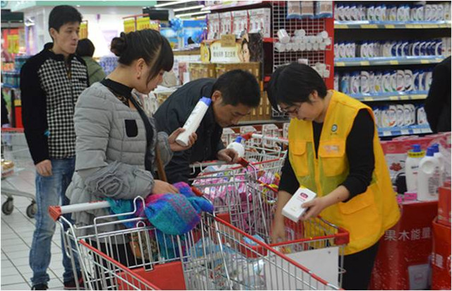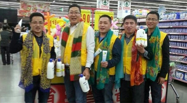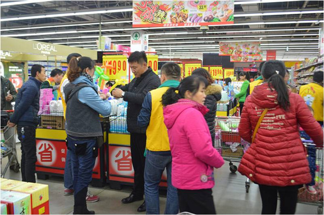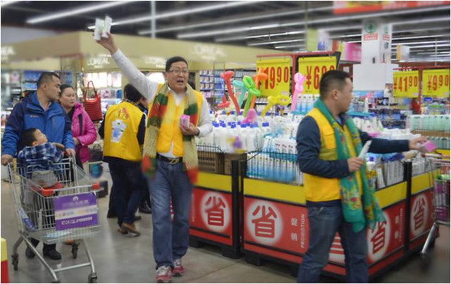 貨箱成為了踏板,手推車、購物籃演變成了道具,隆力奇銷售精英們或踩、或推、或拎,穿梭在日化區(qū)、樓梯道、蔬菜區(qū)、食品區(qū)、收銀區(qū)以及走道,儼然匯聚成了一片橙色的海洋。那都是穿著黃色馬甲的戰(zhàn)神們,為了品牌推廣,為了完成、沖刺銷售目標(biāo),進(jìn)行的爭分奪秒的連帶銷售,攔截潛在客戶,提升成交率,實(shí)現(xiàn)客單價最大化。