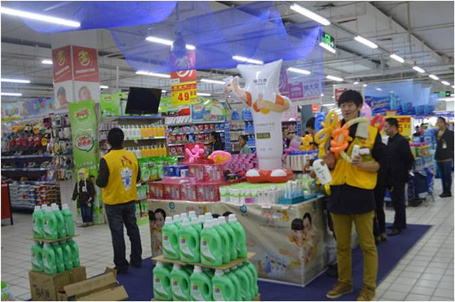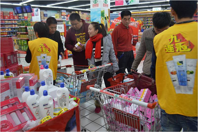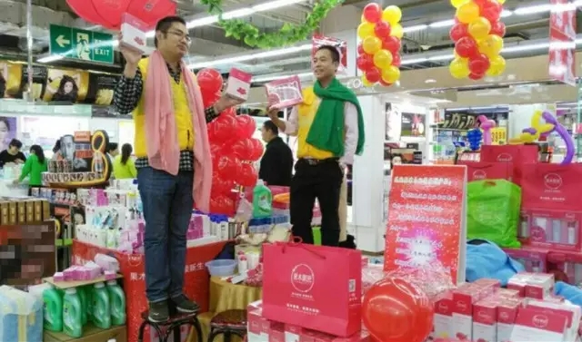 貨箱成為了踏板,手推車、購物籃演變成了道具,隆力奇銷售精英們或踩、或推、或拎,穿梭在日化區(qū)、樓梯道、蔬菜區(qū)、食品區(qū)、收銀區(qū)以及走道,儼然匯聚成了一片橙色的海洋。那都是穿著黃色馬甲的戰(zhàn)神們,為了品牌推廣,為了完成、沖刺銷售目標(biāo),進(jìn)行的爭分奪秒的連帶銷售,攔截潛在客戶,提升成交率,實(shí)現(xiàn)客單價最大化。